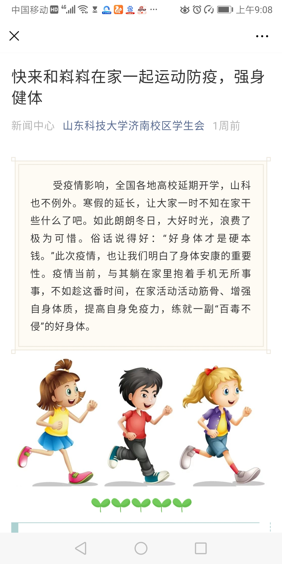 与此同时,校区各级学生组织结合自身实际,鼓励广大学生积极行动起来,从我做起、因地制宜、因人而异,积极开展居家健身活动,切实保证每天锻炼1小时,身心健康不降低,做好抗击疫情家庭健康的第一防护人。