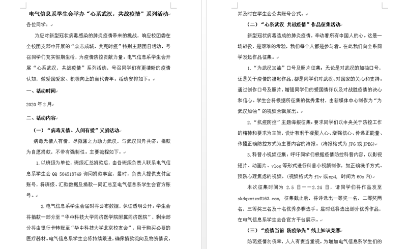 学团工作部扎实开展“众志成城,共克时疫”主题团日活动。财经系组织“预防新型冠状病毒肺炎”主题教育活动,开展新型冠病毒预防大学习、“每日一报”班级打卡、“我们这样做”征文比赛、 战“疫”海报征集评选、“沐浴书香”读书月等活动。电气信息系组织 “韬光养晦 共克时艰”主题教育活动,开展“我为武汉助力”口号征集、“心系武汉 共战疫情”视频素材征集、线上知识竞赛、室内运动锻炼等活动。