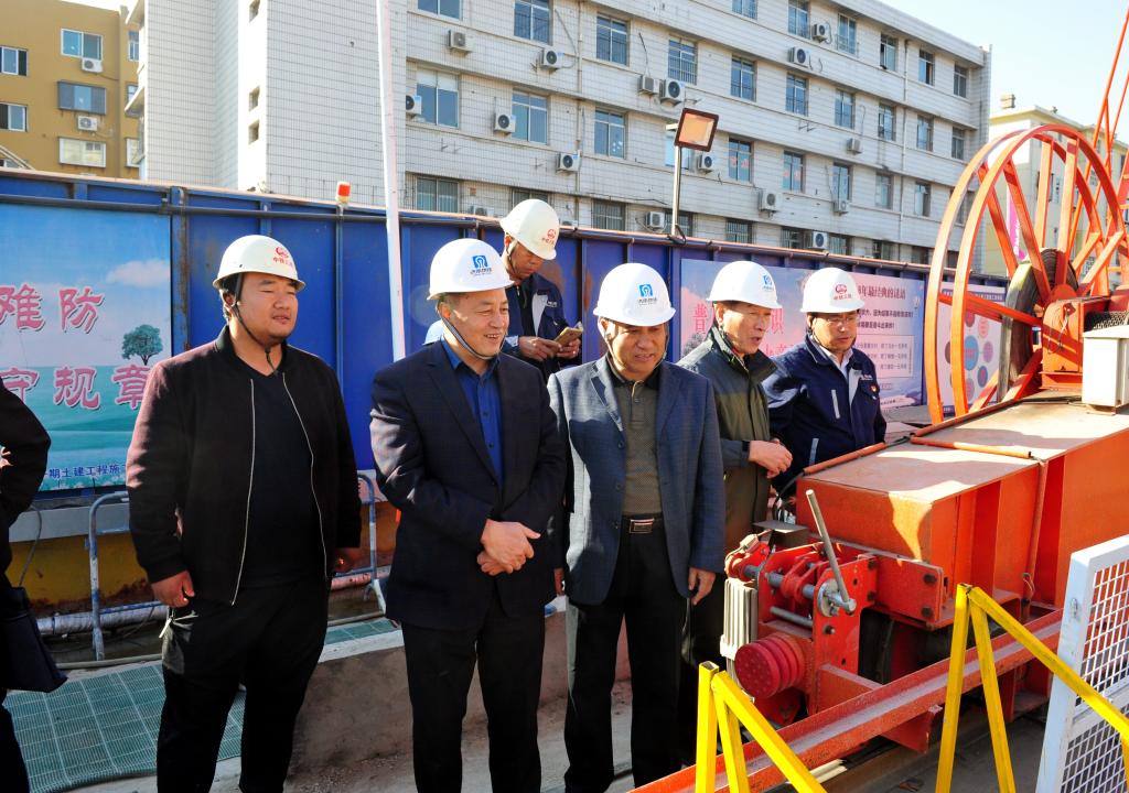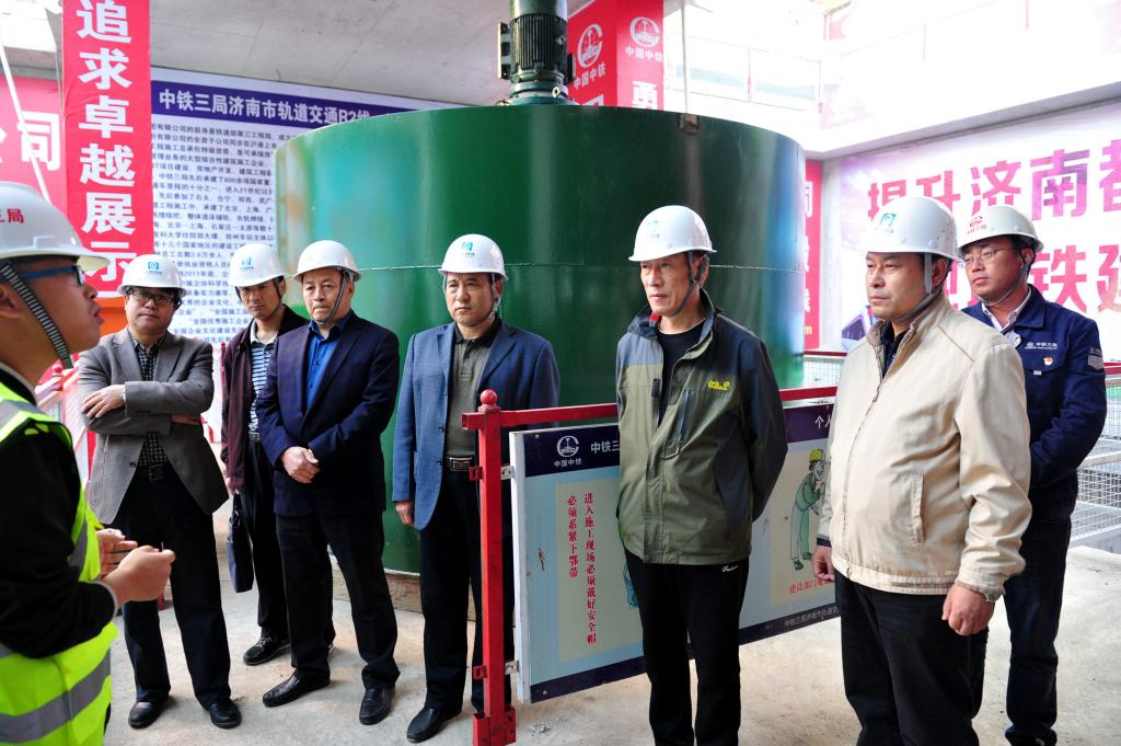 参观现场,中铁三局济南地铁项目部负责人向理论学习中心组成员讲解了万盛北街站的工程概况、技术管理、安全质量管理、目前的施工进度等情况,对开工以来施工场地布置、围护结构施工、基坑降排水与基坑开挖、侧墙防水基面处理等情况做了详细介绍。中心组成员一行深入到地下20余米的施工现场,考察地铁的施工建设情况,与施工技术人员进行现场交流,参观即将投入运行的盾构机,向相关技术人员询问了掘进进度,工作原理及盾构机的有关参数。