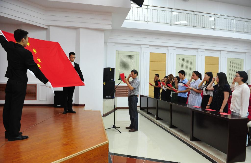 校区公共课部主任王兆立教授带领校区新入职教职工面对国旗庄严宣誓,表达了志愿从事教书育人事业的决心和志向,表示要争做“四有”好老师,为国家繁荣、民族振兴贡献智慧和力量。(摄影:云兵兵)