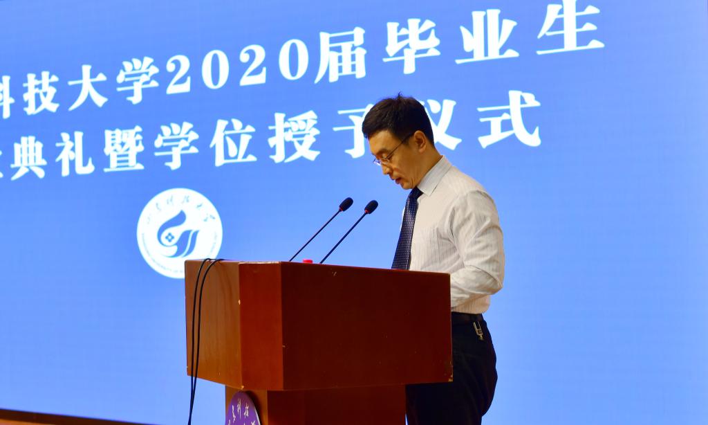 8时30分,在庄严的国歌声中,意义非凡的毕业典礼线上线下同步拉开帷幕。校长姚庆国以《解码工匠精神 雕刻美妙人生》为题向全体毕业生送上深深的祝福。他代表学校向各位毕业生同学表示热烈的祝贺,向辛勤耕耘、无私奉献、哺育同学们成长成才的师长、亲人和朋友们,表示衷心的感谢和崇高的敬意。他指出天降大任多磨砺,疫情无情人有情。疫情当前,全校师生同舟共济,守望相助,自觉肩负起责任,主动投身防控,彰显了科大人的担当与奉献。