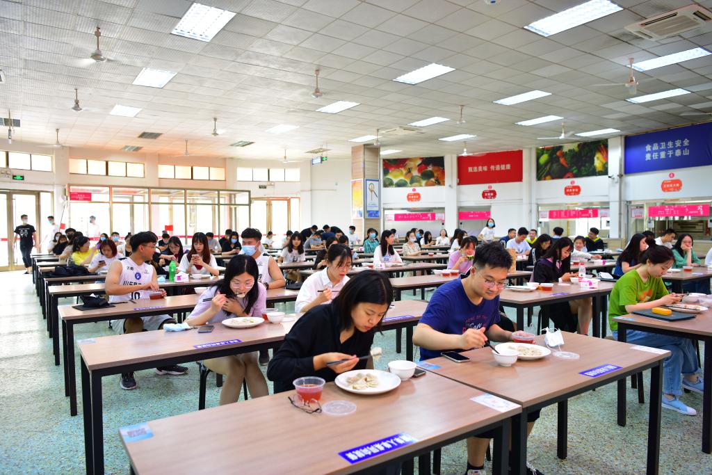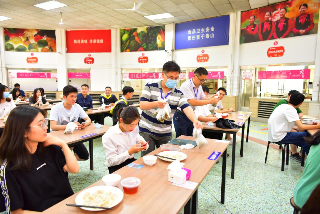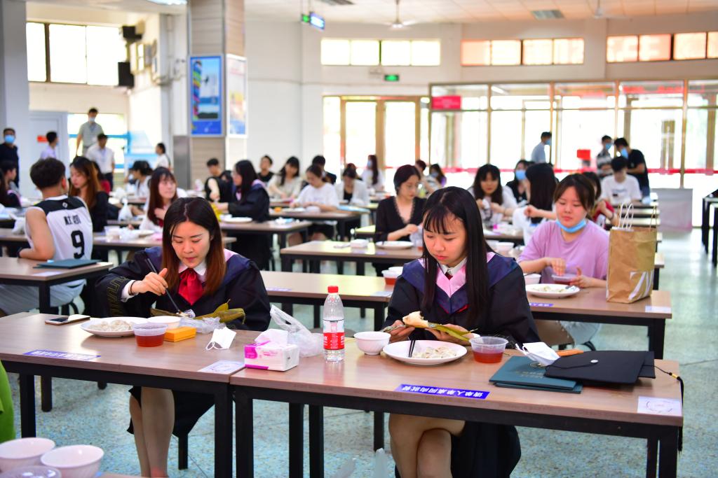 毕业生们在品尝学校精心准备的美味饺子与蜜粽