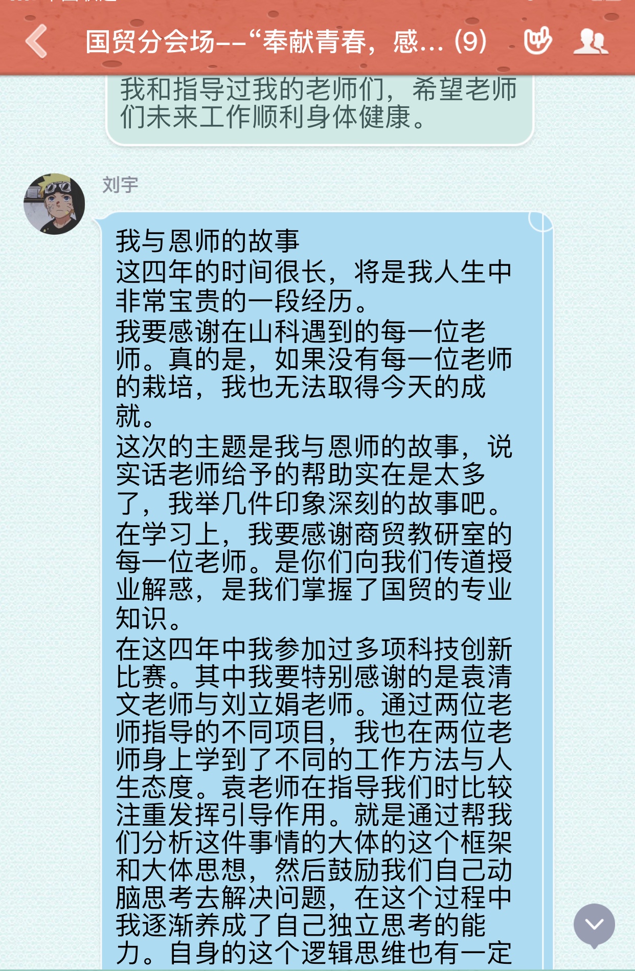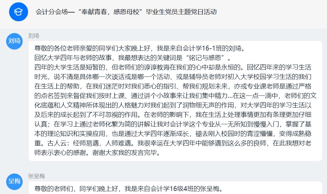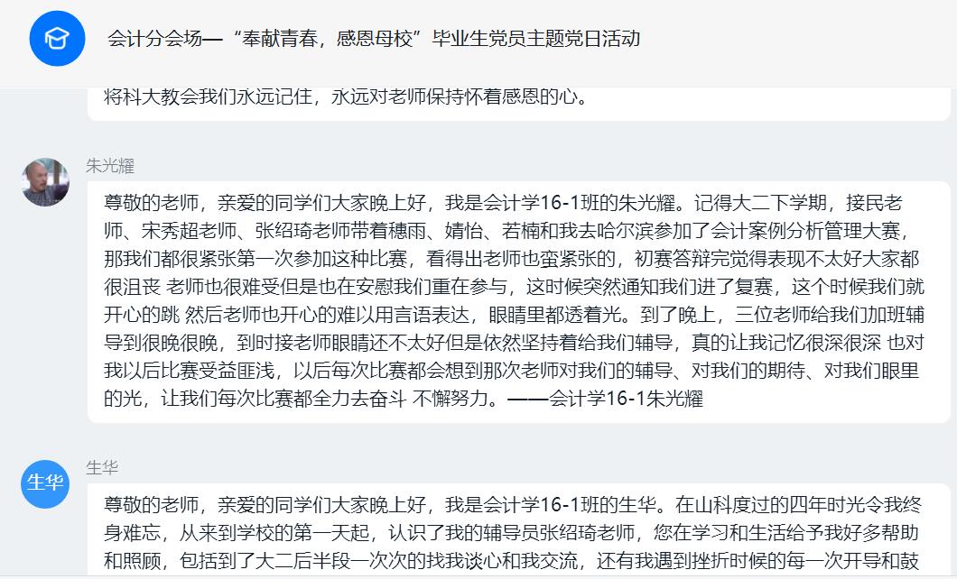 “下面开始分享‘我与恩师的故事’,写下大家最想对母校与恩师说的话”,在“奉献青春,感恩母校”财经系学生党支部毕业生党员主题党日活动中,线上会议群里大家讨论的非常热烈。