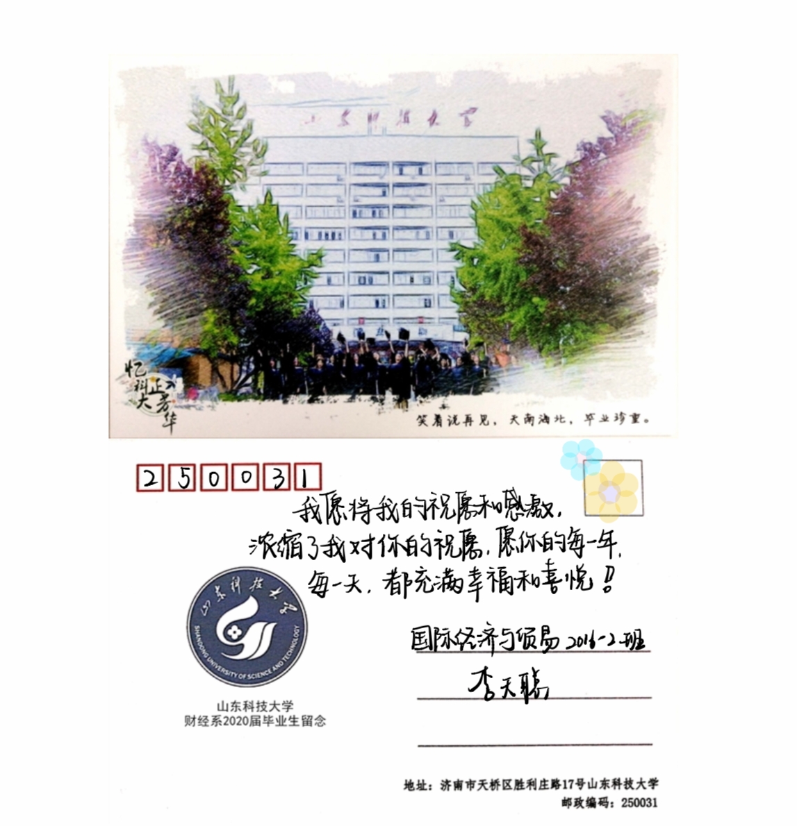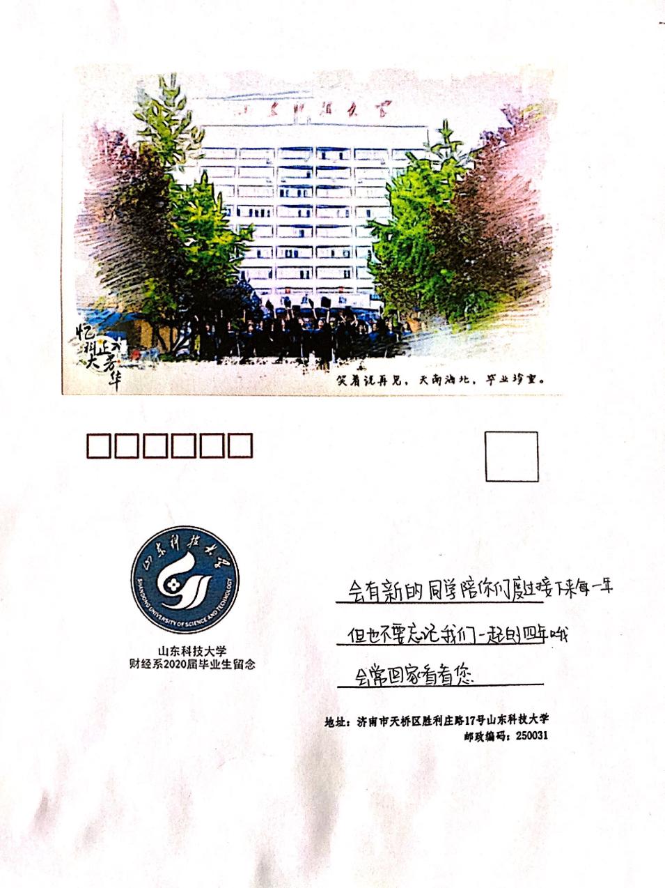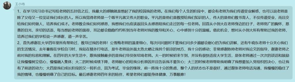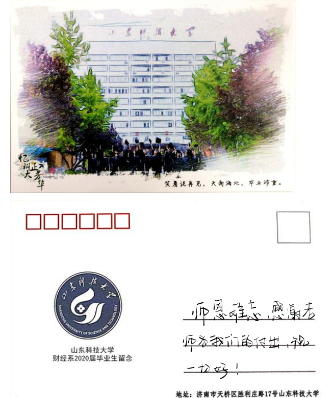 财经系毕业生党员总结了四年中在老师们的教诲下收获的感悟和成长,在线上讨论群里进行“关键词”模式发言,并将自己最想和恩师说的话写于明信片上,留言在学校公众号中,用一支笔寄语恩师,用数行字表达真情。