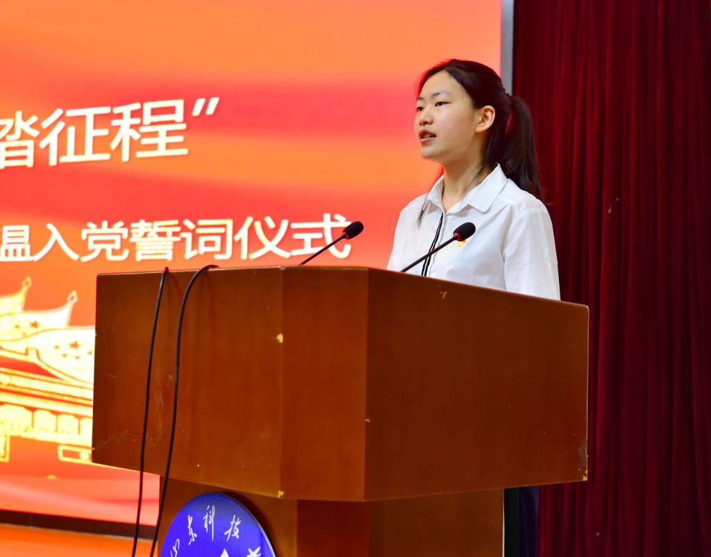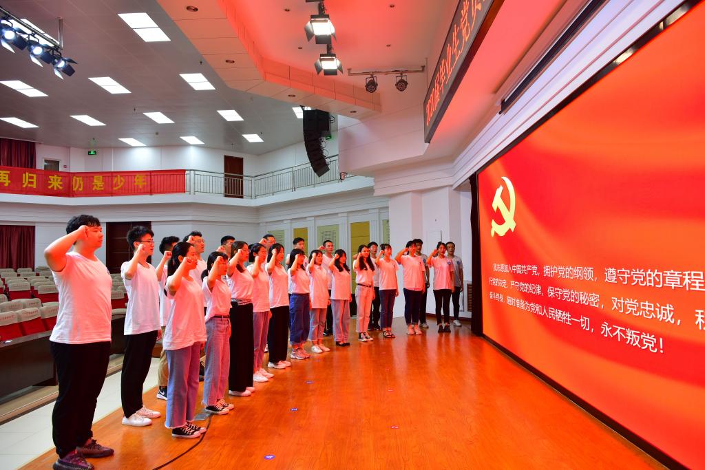 仪式在雄壮的《国际歌》中拉开序幕,在领誓人带领下,毕业生党员面向党旗,紧握右拳重温了入党誓词,回顾铮铮誓言,坚定理想信念,坚守入党初心,牢记职责使命。