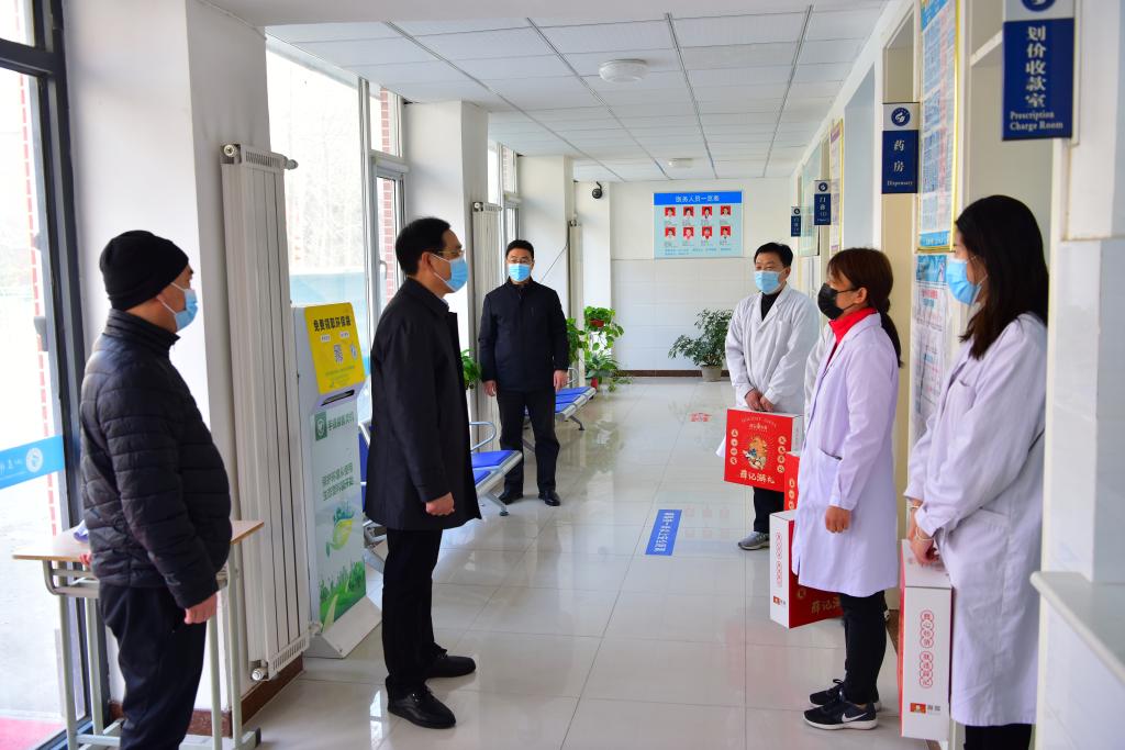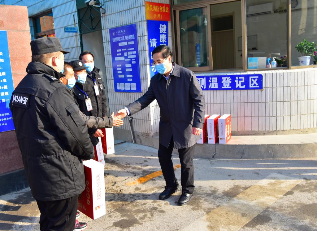 孙鹤汀一行先后来到办公楼值班室、教学楼值班室、医务室、校区门口、家属院值班室、艺体楼工地等看望慰问在岗职工。每到一处,孙鹤汀与值班人员一一握手、亲切交谈,详细了解春节期间校区疫情防控、安保、水电暖运行等相关工作情况,对大家放弃与家人团聚机会、为保障校区安全稳定和正常运转而坚守岗位表示衷心感谢,向他们及家人表达节日问候和新春祝福,同时叮嘱大家加强值班值守,注意自身安全,安排好节日期间的工作和生活。