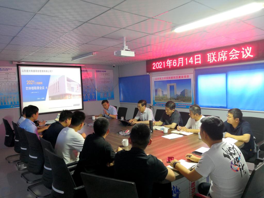 6月14日下午,yl23455永利在艺体楼施工现场会议室召开建设项目管理联席会,就艺体楼封顶后续工作进行研讨。会议由山东建大和盛项目管理有限公司总经理司岩峰主持,副校长兼yl23455永利党工委书记、管委主任孙鹤汀,校区艺体楼建设专班和工程施工、项目管理、工程监理、工程设计、造价咨询等单位负责人及专业技术人员参加会议。