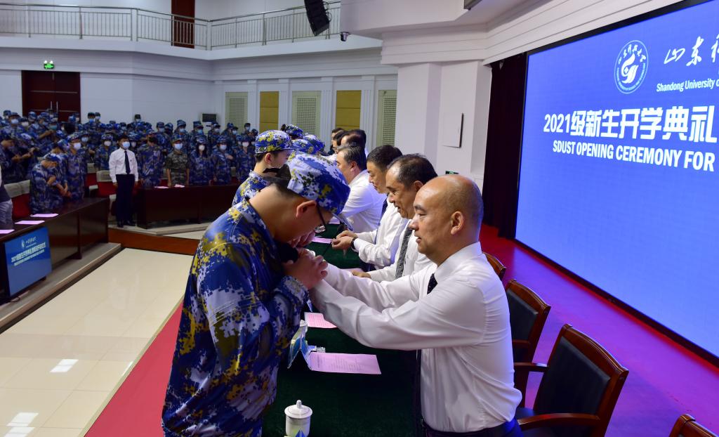 与会领导为新生代表佩戴校徽,全体新生面对国旗庄严宣誓:爱党爱国,牢记使命;爱校荣校,勤学笃行;惟真求新,敢于担当;坚韧不拔,发奋图强;不忘初心,勇做新时代追梦人。