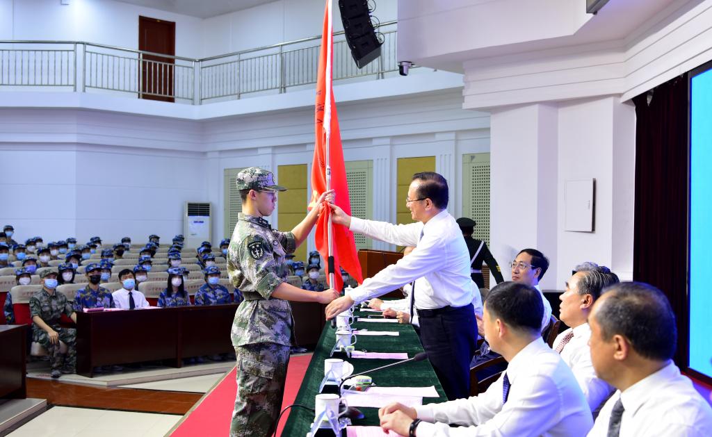 典礼在雄壮的国歌声中拉开帷幕。校党委书记罗公利向军训团授旗。