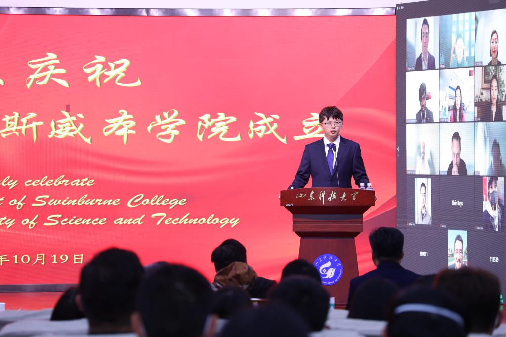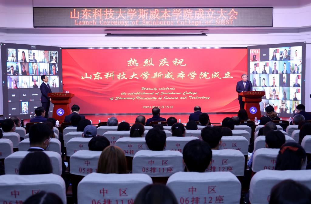 成立大会上,山东省教育厅国际处处长王夫海宣读了《教育部关于同意设立山东科技大学斯威本学院的函》,姚庆国、刘欣堂、李新庆、济南市教育局副局长刘绍辉、天桥区政府副区长李向峰、学校原党委副书记李曙光共同触屏启动“山东科技大学斯威本学院成立”,姚庆国和李新庆为山东科技大学斯威本学院揭牌。斯威本科技大学和澳大利亚教育管理集团向斯威本学院赠送了澳大利亚特色的风车花水晶花瓶和迪吉里杜管。成立大会前,斯威本学院联合管理委员会(JMC)第一次会议举行。