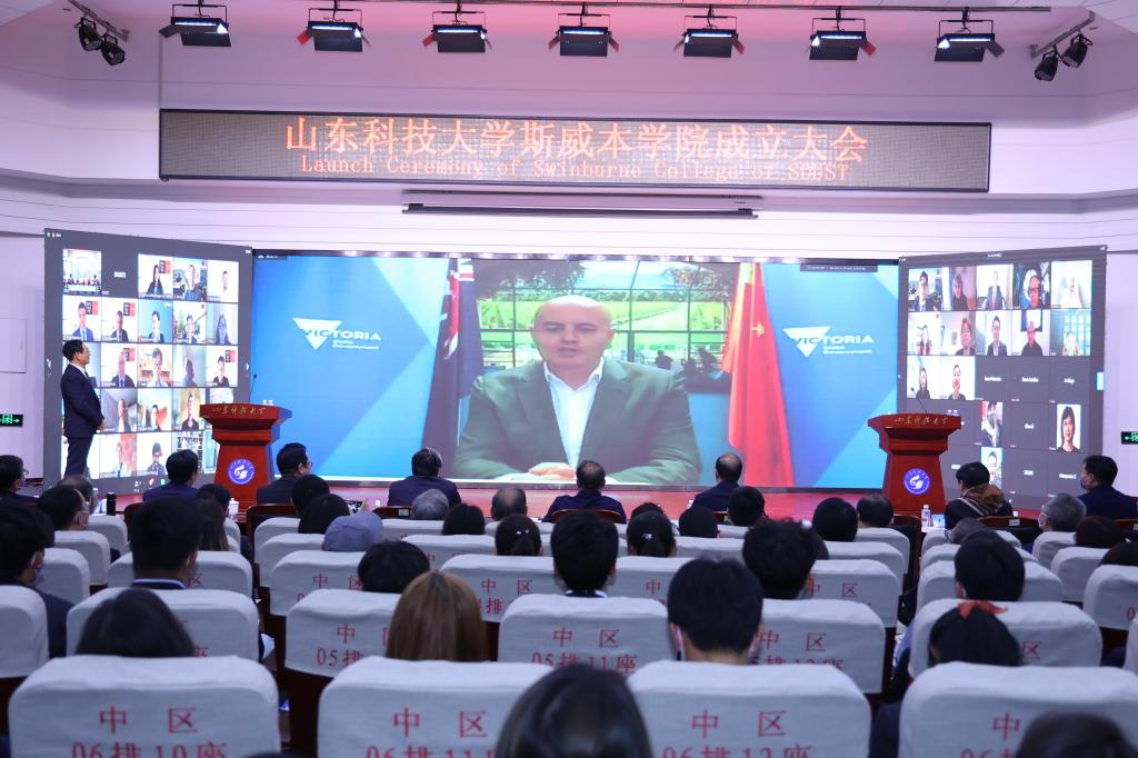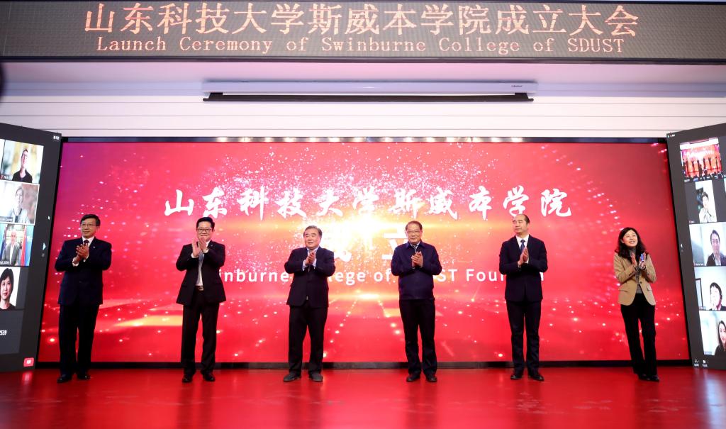 参会领导共同触屏启动“山东科技大学斯威本学院成立”