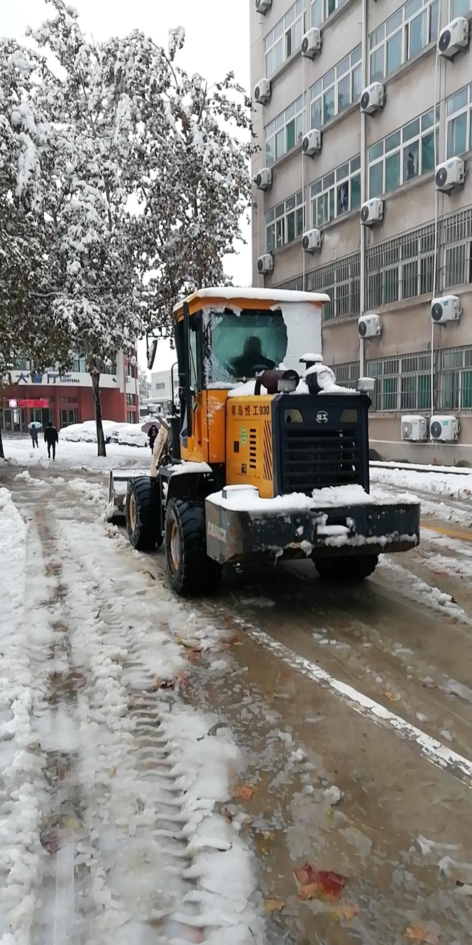 根据天气预报情况,中午12点,校区有关同志在各部门单位负责人工作群发布了消息,号召家住附近的干部职工下午到校铲雪,得到了大家的热烈响应。下午2点半,大家准时来到指定地点,纷纷拿起铁锹、扫帚等工具,从校门口开始铲雪、扫雪。清扫过程中,不断有教职工、学生、艺体楼工地人员等加入志愿队伍,与物业公司员工一起,热火朝天地干起来。后来,艺体楼工地的铲车也加入进来,将路面压实的积雪推到一边,大家再进行清除打扫,机械化加人工,大大提高了工作进度。