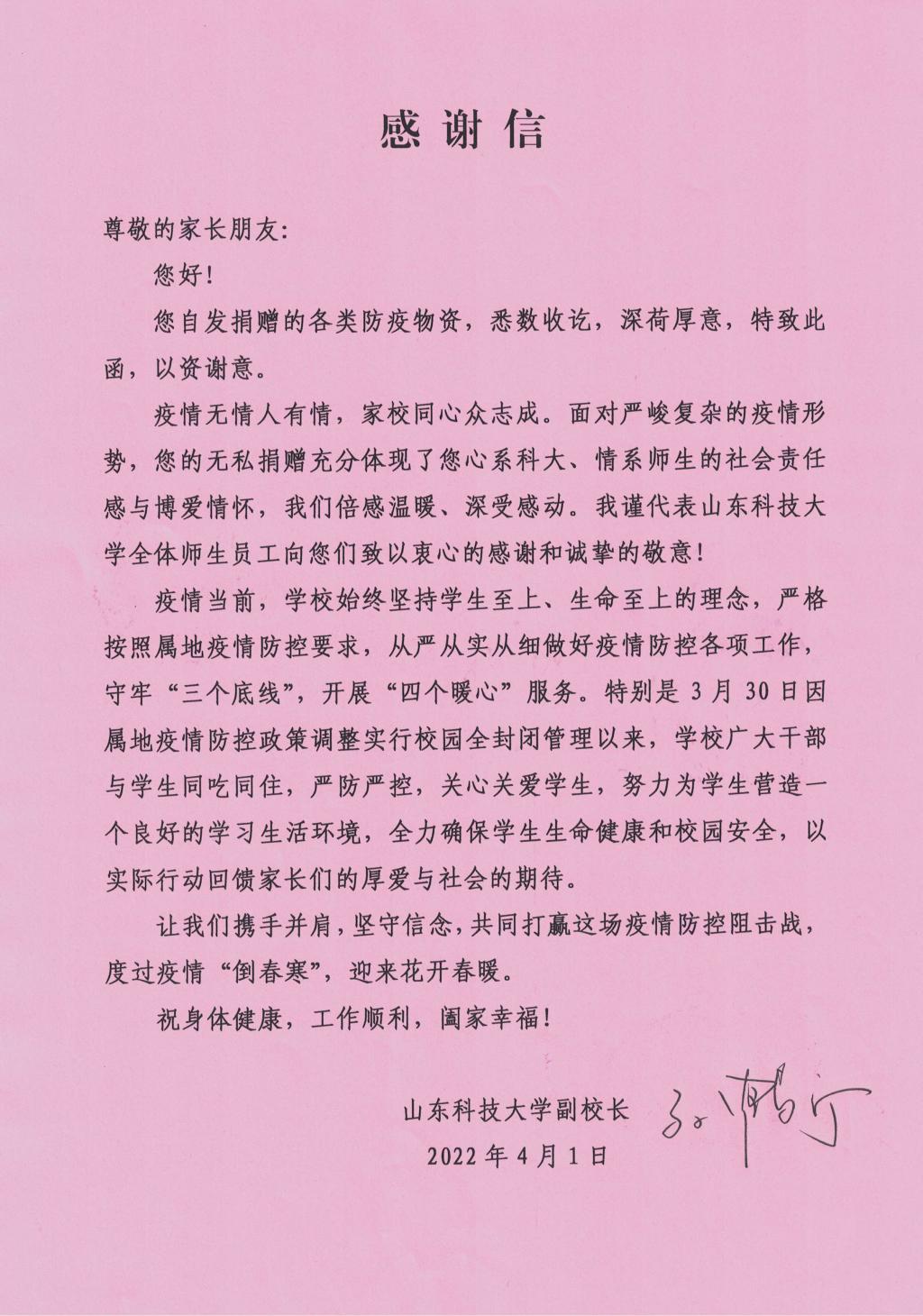 3月28日,斯威本学院机械电子工程专业2021级2班的一名学生家长、潍坊籍孙女士专程向学校邮寄捐赠了一批防疫物资,其中包括10000只口罩和120包消毒湿巾,支持学校疫情防控工作。疫情无情人有情,孙女士的无私捐赠充分体现了学生家长心系科大、情系师生的社会责任与博爱情怀。副校长孙鹤汀代表学校接受捐赠,并以感谢信的方式向学生家长表达诚挚谢意。