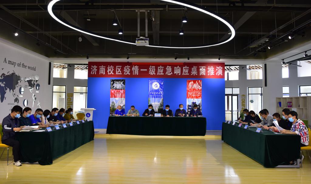 4月9日下午,济南校区在海外学习中心举行疫情一级应急响应桌面推演。校区疫情防控工作领导小组组长孙鹤汀、校区两委成员、各专项工作组组长及相关人员参加推演。