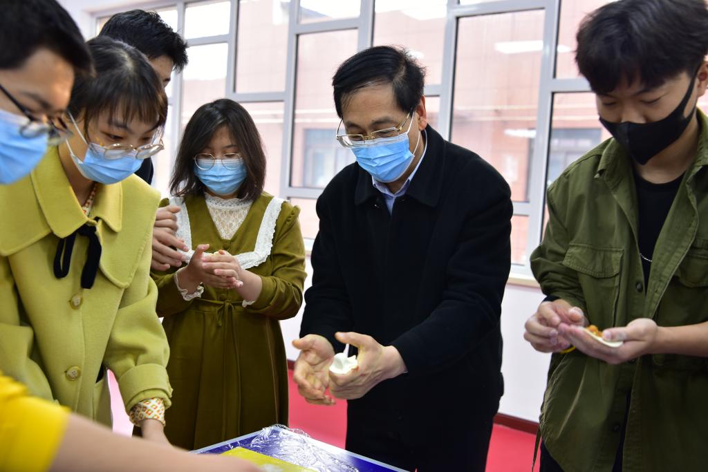 餐厅里专门设立的“妈妈来了”窗口,平素里是为来校区探望学生的家长们提供便利的,家长可以在这个窗口为孩子制作美食,在外享受家的味道。由于疫情校园实行封闭管理,这个窗口向校内学生和驻校老师开放,可通过预约使用,餐厅代购食材。周末,驻校管理人员、学生工作干部和学生们齐动手,一块儿调陷儿、和面、擀皮儿、包水饺,包括副校长兼yl23455永利党委书记、管委主任孙鹤汀在内的“家长们”手把手给学生示范,亲自下厨为学生煮饺子,学生们包得不亦乐乎,吃的喜笑颜开。“口罩隔不开笑脸,疫情挡不住温暖,虽然不能出校园,但师生一齐包水饺,共上一堂劳动课,领导、老师亲和得像父母,校园生活更加暖心。”一名第一次体验包水饺活动的大一新生感触颇深。