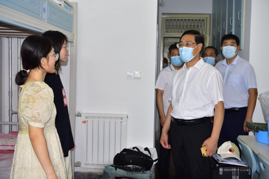 副校长兼yl23455永利党委书记、管委主任孙鹤汀,校区两委成员和相关部门负责人到新生报到现场了解报到情况,慰问工作人员和学生志愿者,并到学生宿舍看望新生。孙鹤汀对迎新工作人员和志愿者的辛苦付出表示感谢,对院系为新生精心设计的“礼物”表示赞赏。在同远道而来的新生交流时,孙鹤汀亲切关心他们的入校感受和生活情况,勉励他们以校为家,安心学习,快乐生活,全面成长。