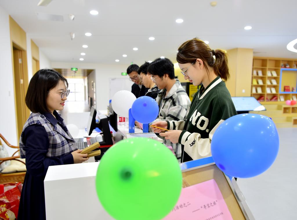 “以书会友”“寻宝之旅”“声临其境”三项趣味活动吸引了师生的广泛参与。“以书会友”活动参与者挑选自己喜欢的图书,并留下自己的感悟和联系方式,据此找到志趣相投的书友,共同读书。“寻宝之旅”活动参与者通过线索猜书名并找到对应书籍,获得藏在书中的文创礼物。“声临其境”活动利用图书馆新建的研讨室让参与者先观看《觉醒年代》《我的1919》《傲慢与偏见》等经典影视片段,然后选择自己喜欢的片段采用英语、普通话、方言进行配音,沉浸式体验语言的魅力。