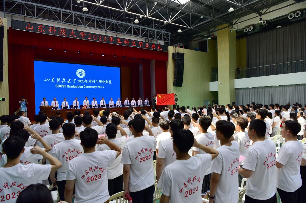 2023届全体毕业生面对国旗庄严宣誓:爱党爱国,牢记使命;爱校荣校,勤学笃行;爱岗奉献,敬业实干;惟真求新,敢于担当;坚韧不拔,发奋图强;不忘初心,勇做新时代追梦人。