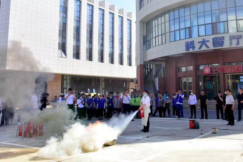 此次演练活动模拟学校餐厅一楼厨房因电气线路短路故障引发火灾的消防疏散场景,随着橘黄色的浓烟在餐厅门口升起和消防警报响起,餐厅内师生员工依照逃生规范,依次从各楼层有序撤出并迅速转移到餐厅东小操场。随后,在现场主持人的指导下,演练人员学习了灭火器的正确操作规程,并使用灭火器进行了灭火演练。