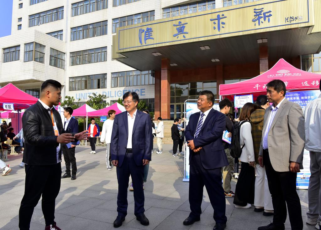 山东科技大学党委常委、副校长兼yl23455永利党委书记、管委主任徐龙飞,校区党委副书记贾长响,校区管委副主任郭加书、孙国强,天桥区公共就业和人才服务中心副主任李茜茜以及相关部门负责人到现场指导,与用人单位及毕业生进行深入交流。在与企业交流中,深入了解企业发展和对人才的需求,介绍校区的专业优势和人才培养情况,希望进一步深化校企合作,为毕业生提供更多的实习和就业机会;在与求职毕业生的交流中,鼓励毕业生把握求职择业机会,厚植家国情怀,为国家和社会贡献青春才智。