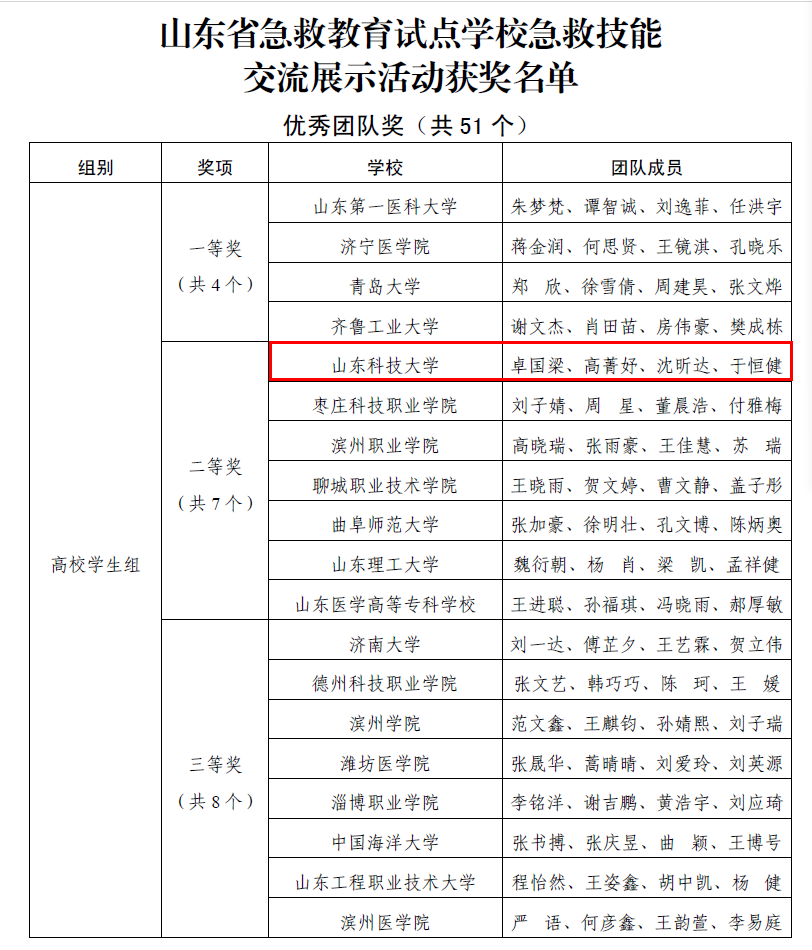 近日,首届山东省急救教育试点学校急救技能大赛在济南落下帷幕,由校区学生卓国梁、高菁妤、沈昕达、于恒健、指导教师马卫组成的参赛队代表学校参加了比赛。经过赛前的认真准备和激烈紧张的比赛,荣获优秀团队二等奖,为学校争得了荣誉。