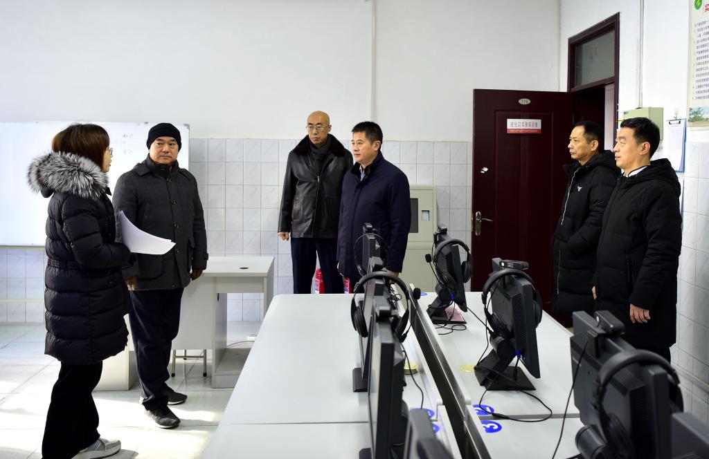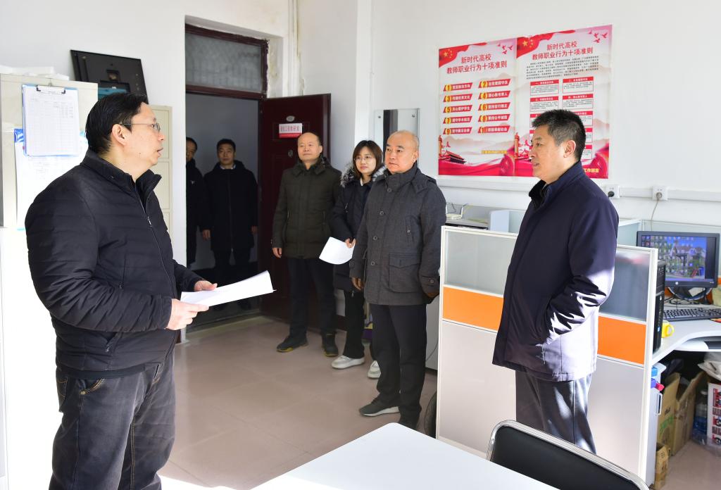 集中座谈交流结束后,梁赛江、郭加书带领班子成员深入办公室、实验室、教研室、教室、消防控制室、艺体楼等处进行现场调研,对规范实验室管理、优化环境等提出具体要求,并要求大家根据部署安排做好寒假有关工作,确保校园安全稳定。(摄影:董俊峰)