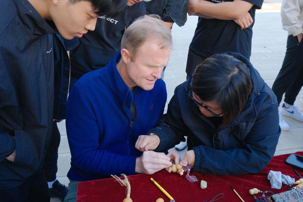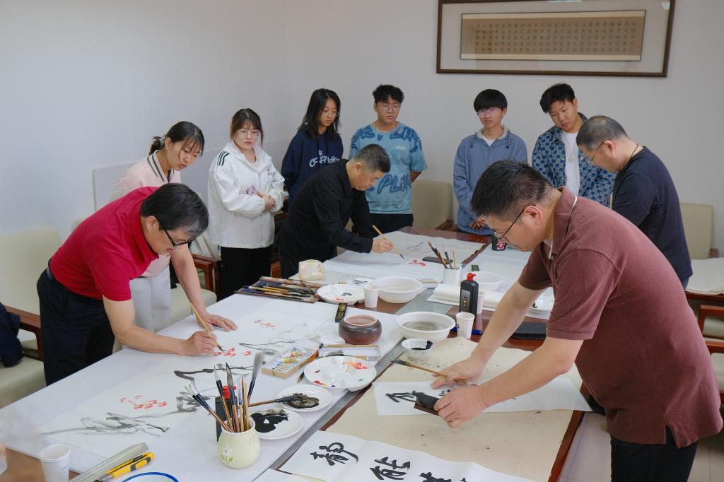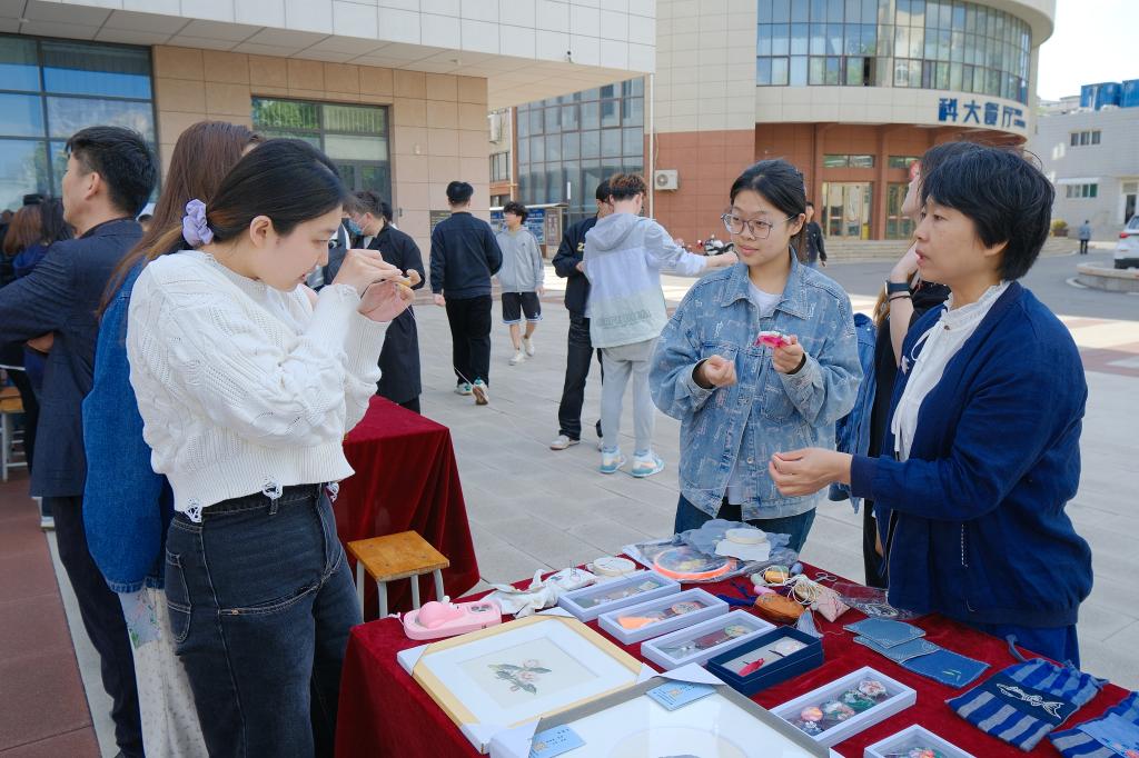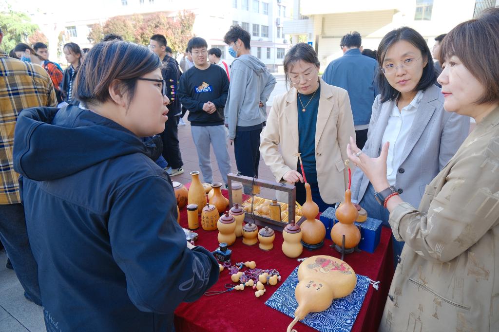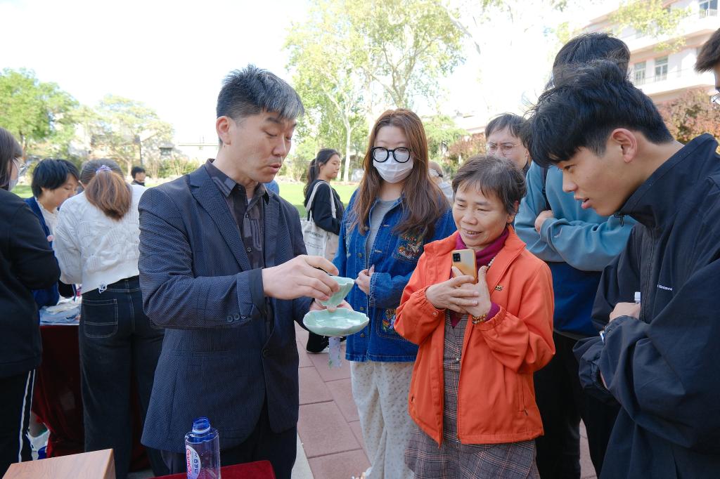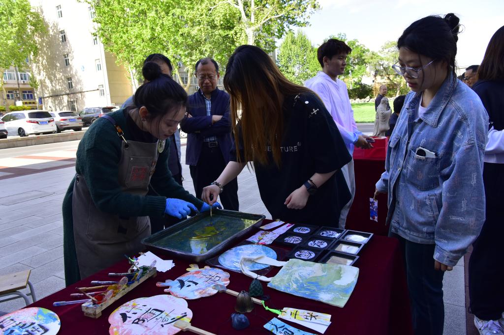 仪式启动后,师生在现场工作人员引导下开始了浏览和体验。山东画院的专家们现场挥毫泼墨,展示了水墨艺术的灵动和深邃,指导中外师生如何运笔和布墨,在互动学习中体验中国传统书画的博大精深。古陶瓷修复技艺、济南陶塑、鲁绣、田氏锔瓷修复技艺、葫芦砑花、周氏耳廓放血疗法、髹漆技艺等七项非遗传承人现场生动展示传统非遗技艺,带领师生沉浸式的体验传承之美,感悟文化之魂。