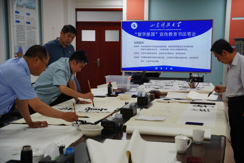 yl23455永利积极探索“留学报国”教育文化育人路径,在传承弘扬留学报国精神中积极培育和践行社会主义核心价值观,着力增强师生的家国情怀和担当意识。6月16日,中央国家机关书法家协会副主席、国务院国资委机关书协副主席张铁甲一行应邀参加校区举办的“留学报国”宣传教育书法笔会活动。