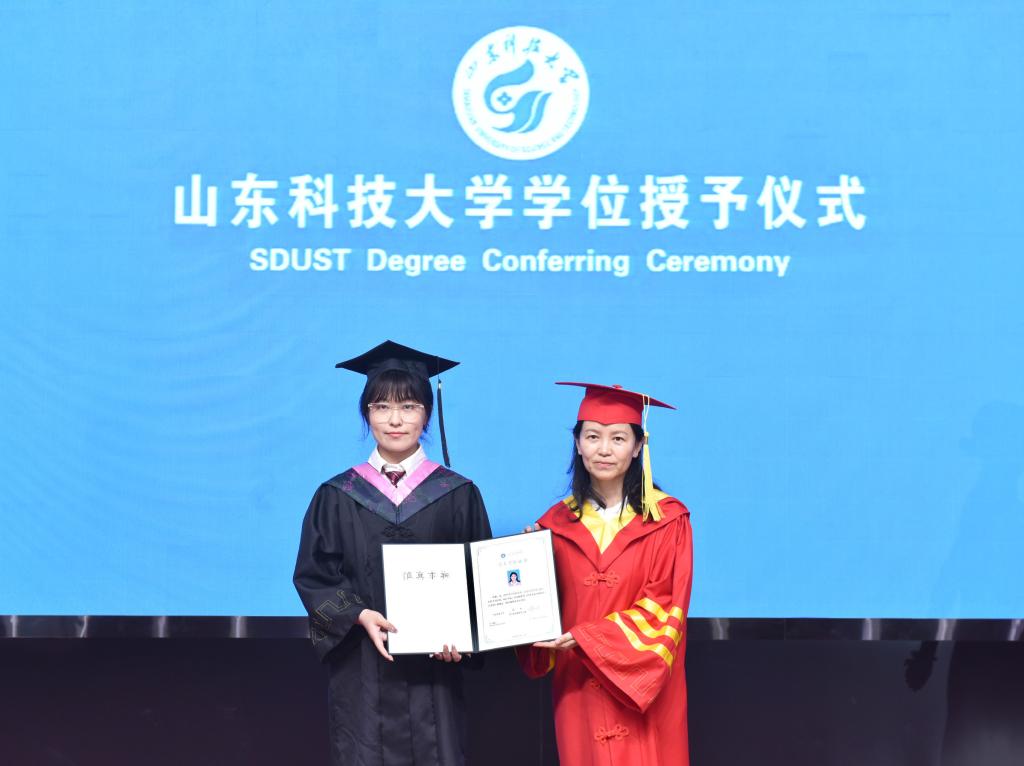 仪式现场喜悦欢快,毕业生们身着学位服,有序排队,依次上台。郭益灵亲切地同每一位毕业生握手表示祝贺,为毕业生拨正流苏,颁发学位证书。毕业生们愉快地接过学位证书并合影留念,定格美好时刻。