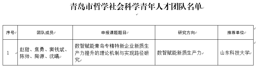 近日,青岛市社会科学界联合会公布“青岛市哲学社会科学青年人才团队”名单,校区赵甜博士作为带头人的“数智赋能新质生产力”青年人才团队成功入选。