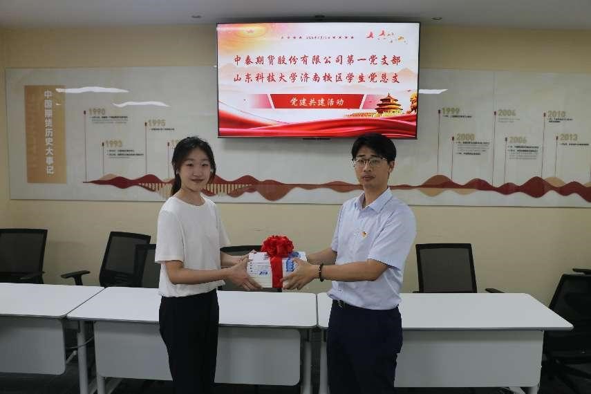 在中泰期货股份有限公司济南分公司任职的我校2018届、2019届毕业生李兆瑞、张翰林向大家分享了从业经验和体会,并向2025届毕业生代表赠送了期货就业资格考试相关学习资料。