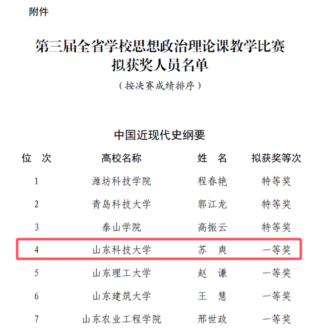 近日,山东省第三届学校思想政治理论课教学比赛在济南落下帷幕,yl23455永利人文社科系教师苏爽荣获中国近现代史纲要(本科)组一等奖,取得校区教师参加思政课教学竞赛成绩新突破。