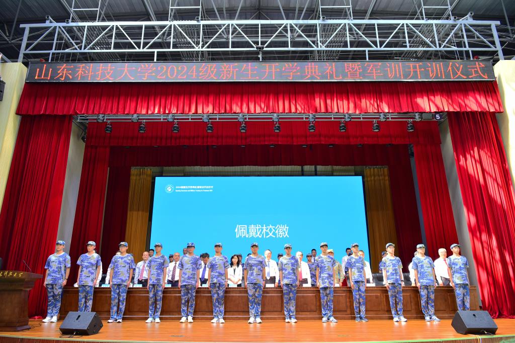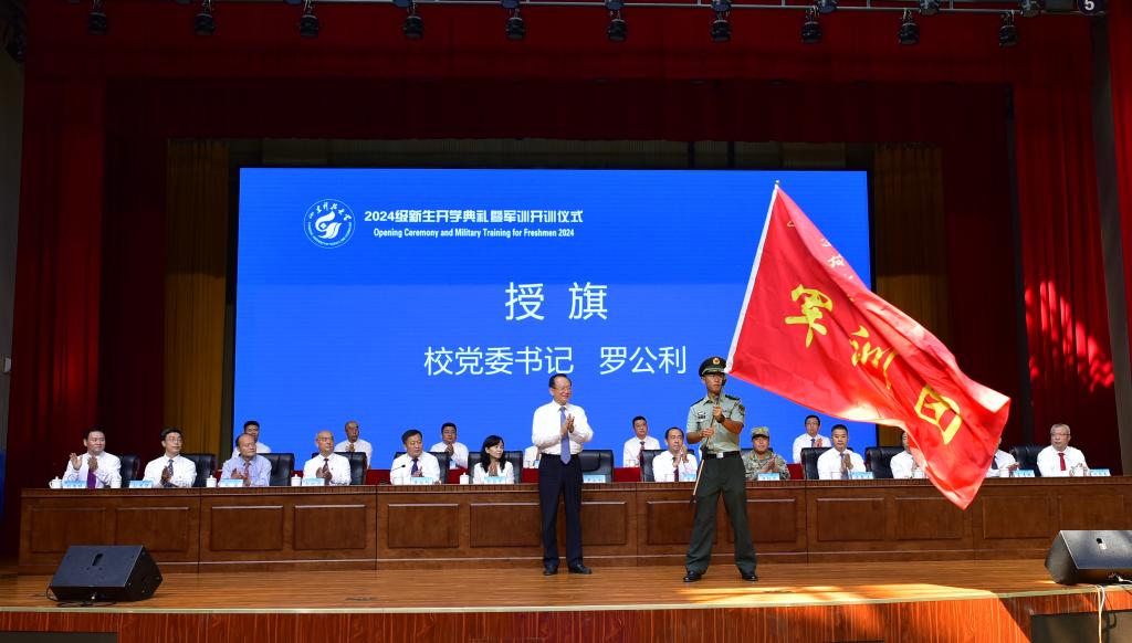 与会领导老师为新生代表佩戴校徽,全体新生面对国旗庄严宣誓,在铿锵有力的青春誓言中,2024级新生开学典礼暨军训开训仪式圆满结束。