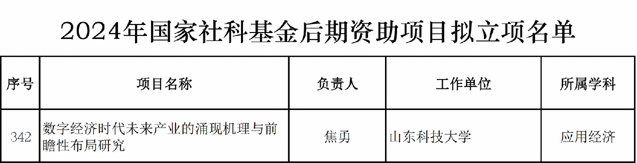 近日,2024年度国家社科基金后期资助项目立项结果揭晓,焦勇教授申报的课题《数字经济时代未来产业的涌现机理与前瞻性布局研究》荣获立项,标志着校区在国家社科基金项目申报方面取得新突破。