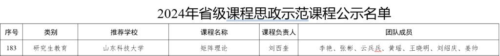近日,山东省教育厅公布2024年度省级课程思政示范课程名单。刘西奎教授主持建设的课程《矩阵理论》获评山东省课程思政示范课程研究生教育课程。