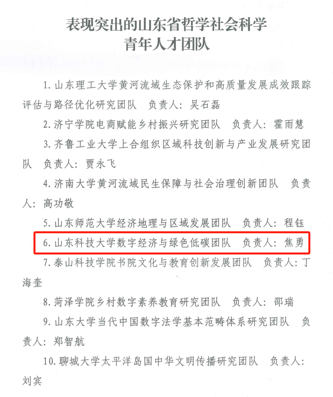 近日,省社科联为选树先进、进一步发挥典型示范带动作用,对表现突出的山东省哲学社会科学青年人才团队进行了通报表扬。其中,由焦勇教授主持的“数字经济与绿色低碳团队”表现优异,脱颖而出,成为12支获通报表扬的团队之一。(科研部供稿)