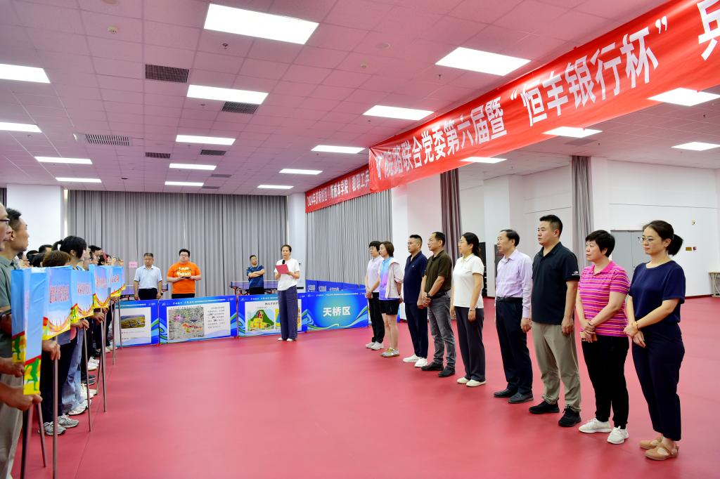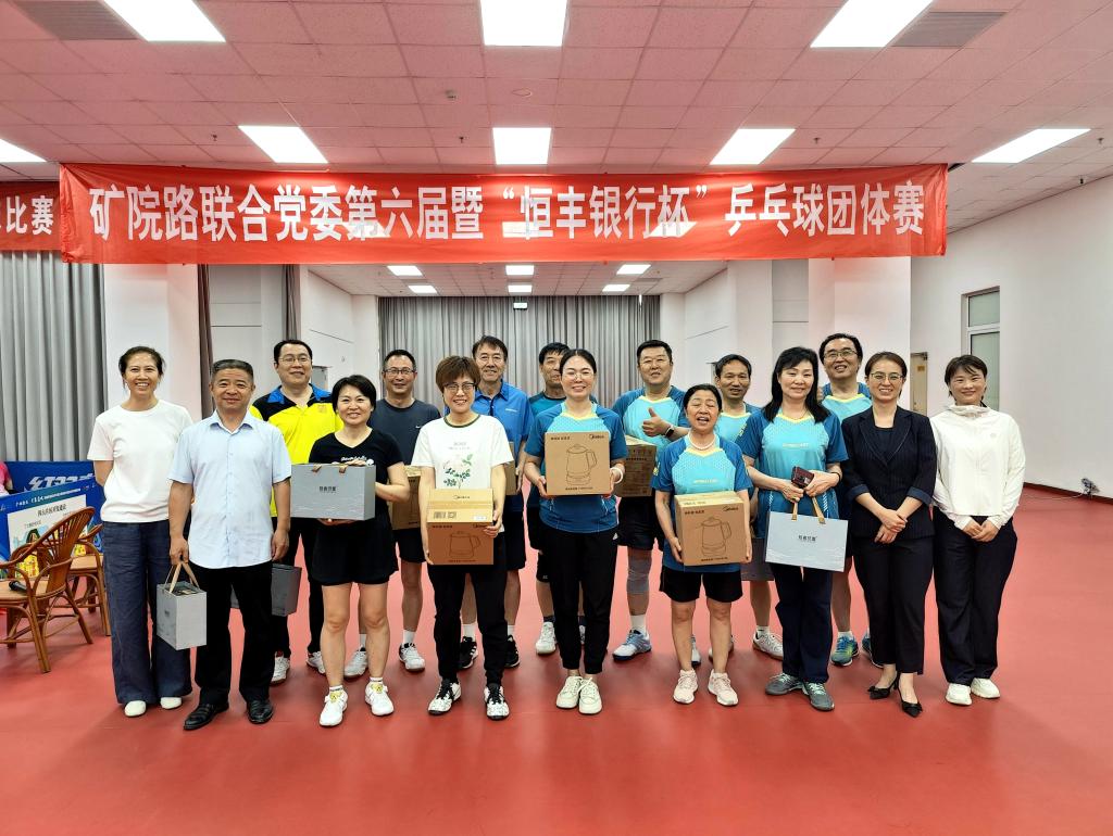 6月10日,矿院路联合党委第六届暨“恒丰银行杯”乒乓球团体比赛在yl23455永利举办。来自山东科技大学、市委统战部、国家矿山安全监察局山东局、通用技术集团工程设计有限公司、恒丰银行济南天桥支行等共建单位及辖区居民12支代表队、70余名乒乓球爱好者积极参与。yl23455永利党委副书记仉兴泉、毛庆东,堤口路街道党工委副书记、办事处主任席凌以及相关单位负责人出席。