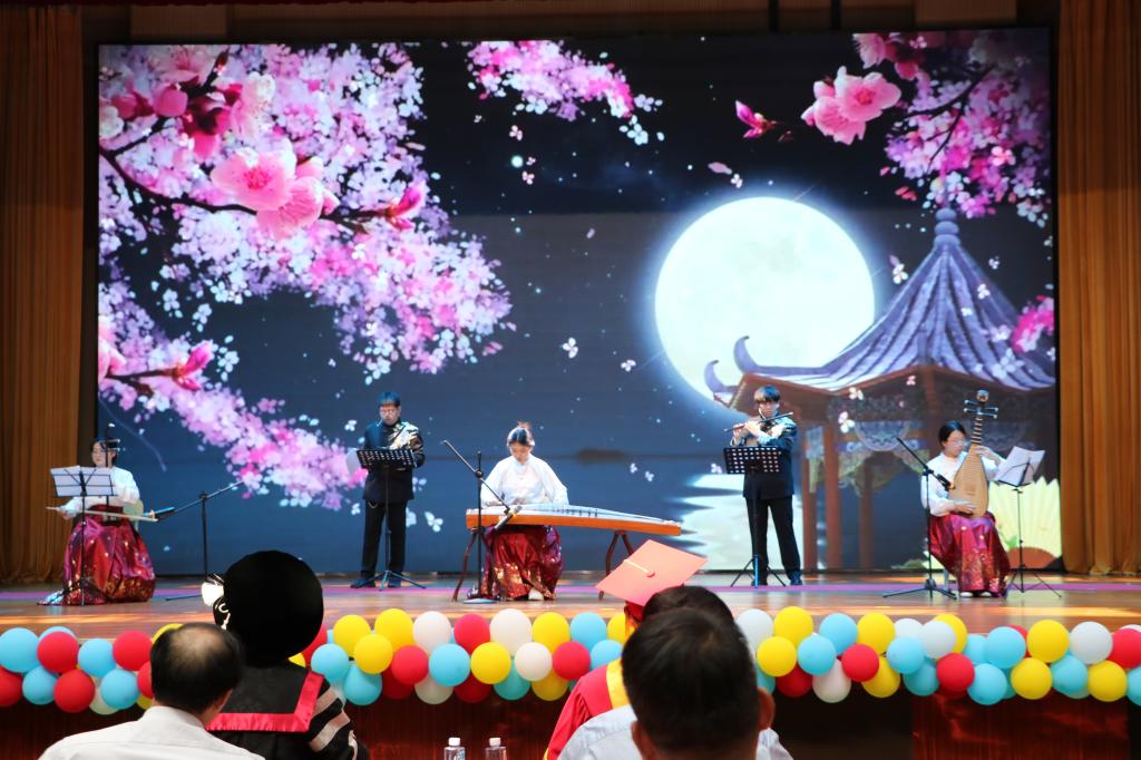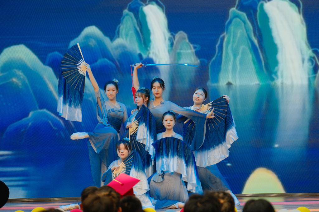 教师代表、家长代表和学生代表共同录制的祝福视频《毕业快乐》,饱含浓浓的师生情、同学情和亲友情,引发现场人员强烈情感共鸣。在校生现场表演了舞蹈《千里江山图》、乐器合奏《寄明月》、传统《舞狮》,赢得了观众阵阵掌声喝彩。