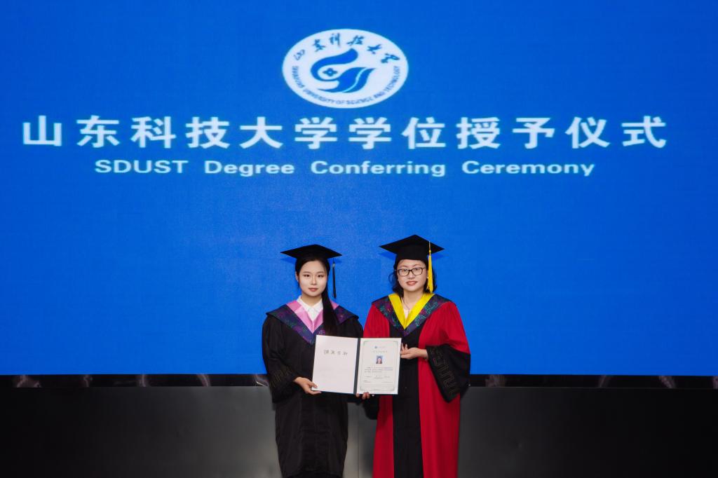 仪式现场气氛庄重而热烈,毕业生们身着学位服,脸上洋溢着收获的喜悦,排队依次上台接受学位授予。董海荣亲切地同每一位毕业生握手,表达诚挚祝贺,并为他们拨正流苏,颁发学位证书。毕业生们满怀喜悦地接过学位证书并合影留念,定格美好时刻。