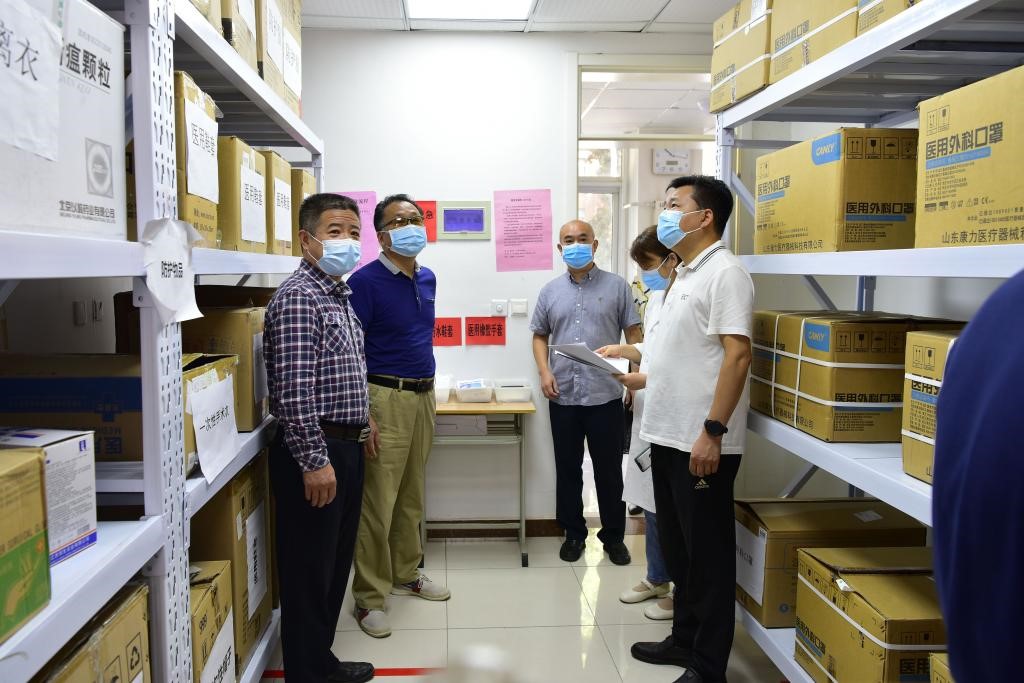在医务室检查人员重点检查了场所码张贴、疫情防控物资储备、发热人员跟踪以及台账梳理等疫情防控措施落实情况。