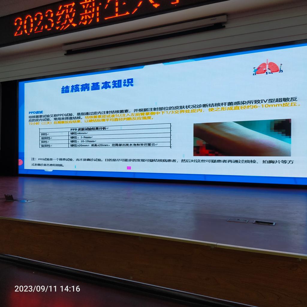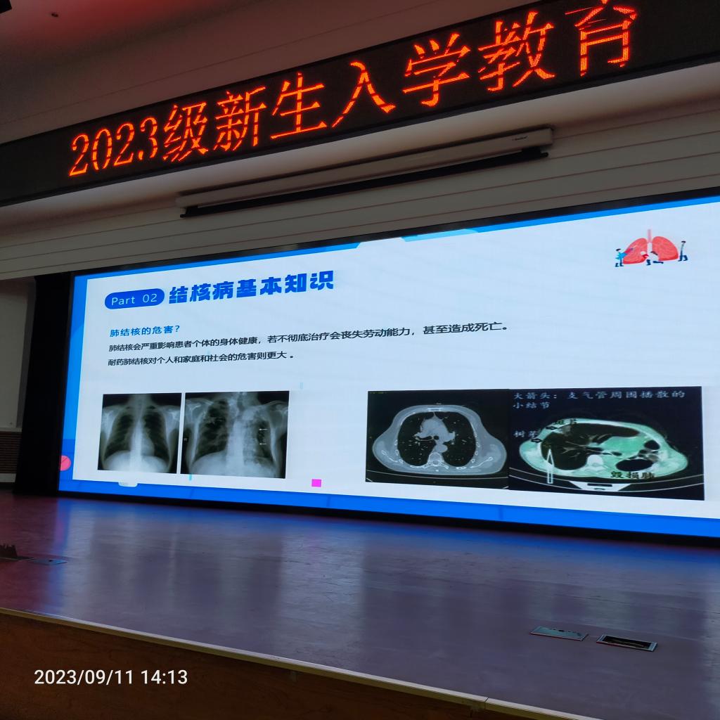 刘倩医师为同学们讲解了肺结核的防治知识。刘倩医师就结核病的发展史、结核菌传染途径、预防措施、典型症状、易发人群、治疗原则、预防措施等方面进行了详细的讲解,让同学们对结核病的防控有了全面的了解。