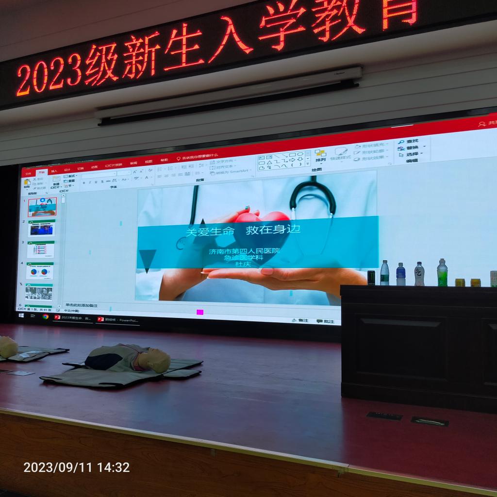 为促进2023级新同学进一步了解健康的基本知识,增加同学们对健康意识的重视度,激发大学生自救互救意识和应对突发事件的处置能力,结合我校迎新工作部署,9月11日下午,校区邀请了省立三院呼吸科刘倩医师和济南市第四院人民医院的杜庆医师来校举办“2023级新生入学教育健康知识讲座",医务室医护人员及近600名新生聆听了讲座。