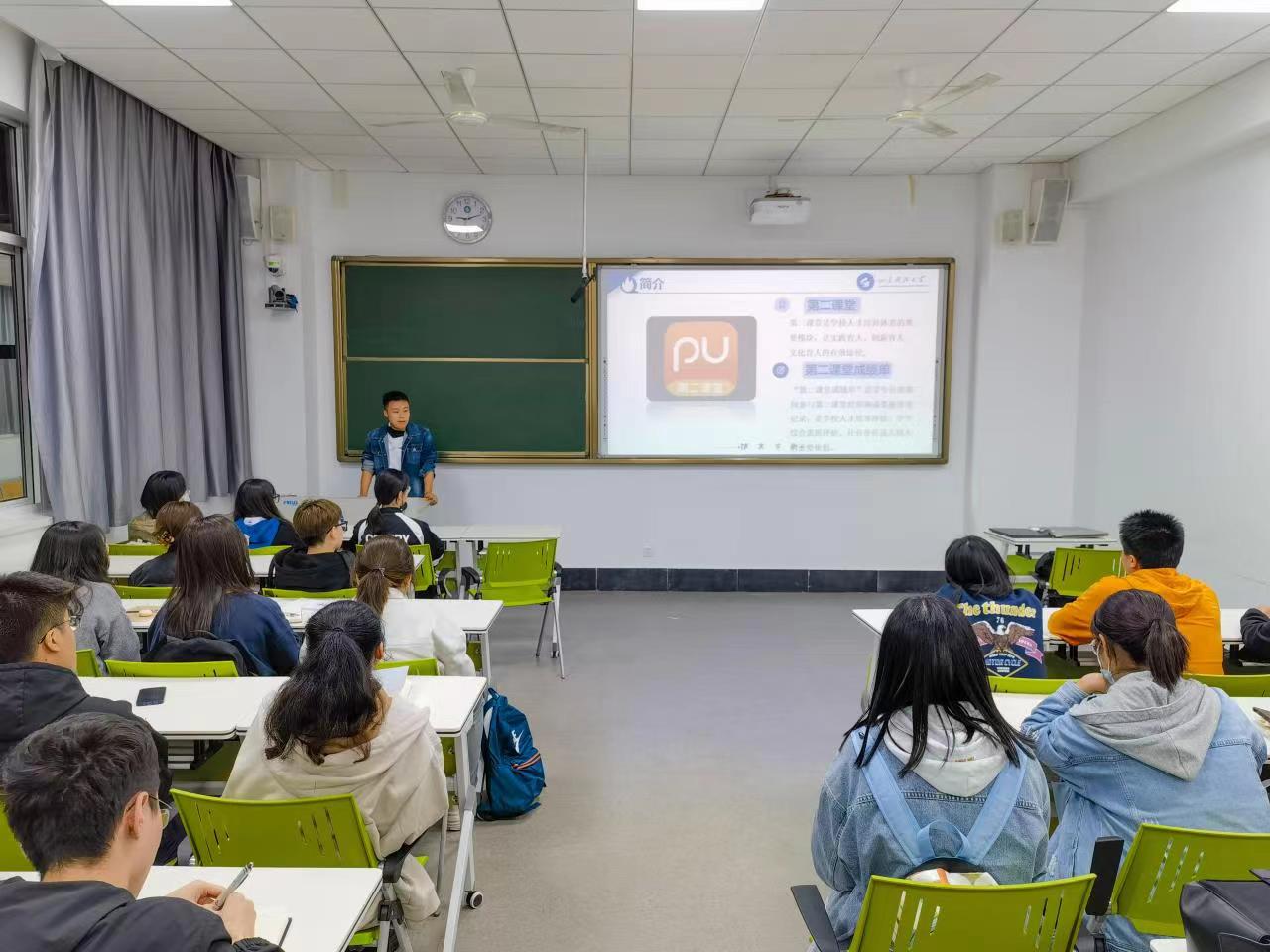王腾宇就第二课堂成绩单课程设置、学时认定与管理、认定程序、PU口袋校园使用说明、第二课堂管理部介绍等五个部分进行了全面生动的讲解。最后,针对PU口袋校园使用时常遇到的问题以及同学们的疑惑王腾宇一一为大家进行了解答。