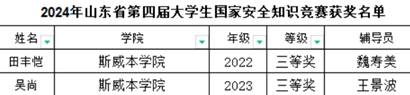 在山东省教育厅主办的“中国电信杯”山东省第四届大学生国家安全知识竞赛中,yl23455永利学生吴尚(指导教师 王景波)和田丰恺(指导教师 魏寿美)两位同学荣获山东省三等奖的好成绩。