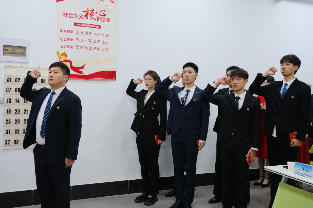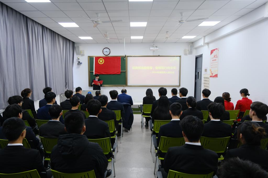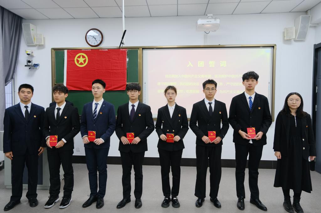 韩冰宣读了2024年新团员名单。马力为新团员佩戴团徽,王景波为新团员颁发团章,王龙带领新团员宣誓,肖忆同学作为新团员代表发言。