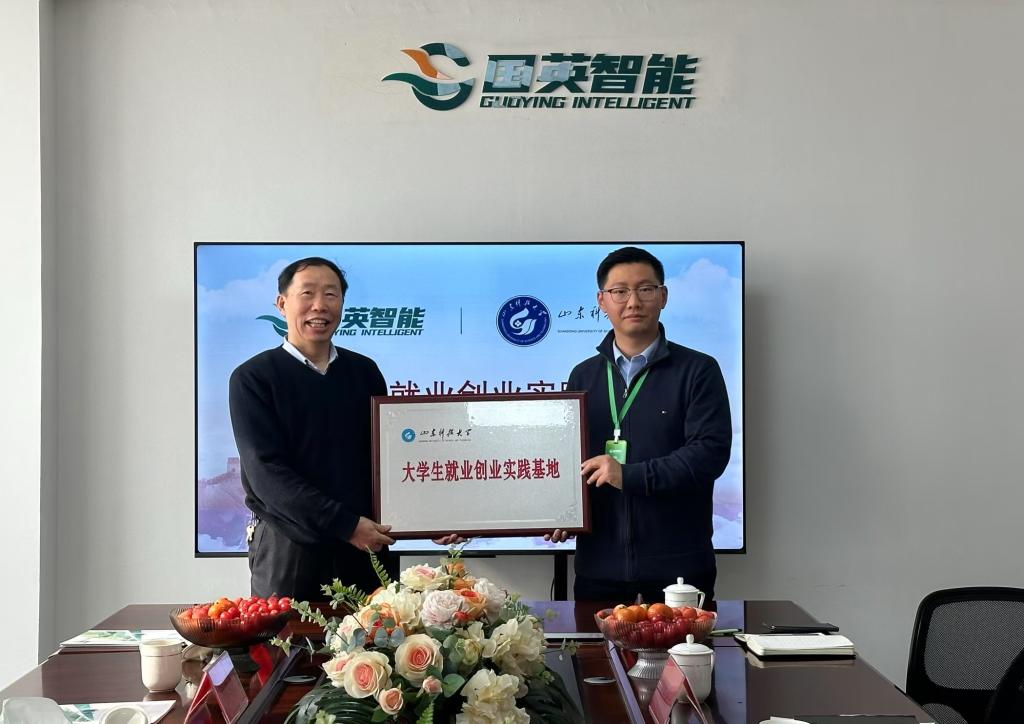 毛庆东一行参观了国英智能科技(山东)有限公司并开展了座谈交流。国英智能科技(山东)有限公司总经理张士峰详细介绍了企业发展历程、企业文化、企业经营状况及毕业生需求等情况。刘西奎从学校办学规模、专业设置、人才培养、毕业生就业、科研合作等方面介绍了情况,希望双方在学生毕业实习、学生就业、科技研发、科技成果转化等方面加强交流合作,实现校企双赢,共同发展。毛庆东向国英智能科技(山东)有限公司授予“山东科技大学大学生就业创业实践基地”标牌。
