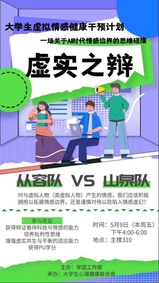 近日,校区“心灵之辩,洞察人生”主题辩论赛决赛在主楼310开赛。经过前期多轮激烈角逐,由软件工程专业和通信工程专业学生组成的从容队、电气工程及其自动化专业学生组成的山泉队两支实力强劲的队伍脱颖而出,会师决赛。校区学团工作部学生组织相关指导老师担任主评委,大学生心理健康联合会相关成员担任大众评委。