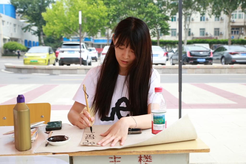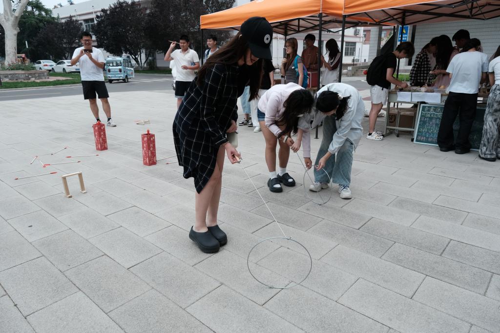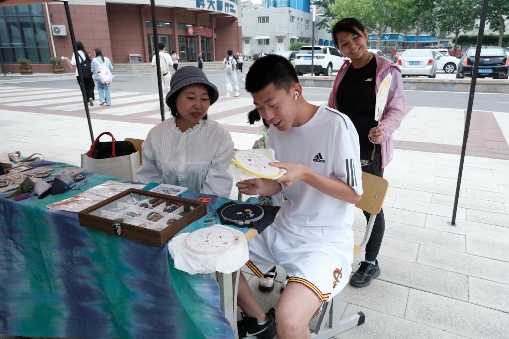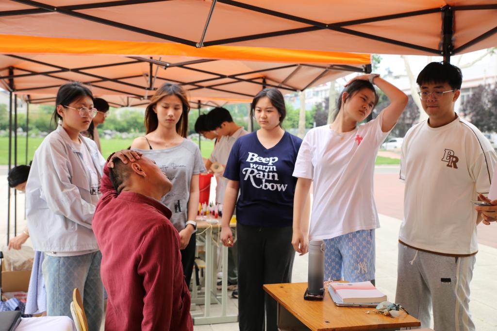 活动现场,传统体育项目区尽显蓬勃朝气,同学们执箭投壶,躬身行礼间品味古人宴饮雅趣;手握推杆,追逐奔跑中感受滚铁环的速度激情;挥动球杆,击丸入洞时探寻古代球类运动的千年奥秘。手工技艺体验区更是人气高涨,成为优秀传统文化传承的活力课堂。漆扇、书法、扎染、香囊制作、绘制风筝、植物拓染等活动精彩纷呈。鲁绣、正骨推拿技艺传承人走进校园,为师生带来一场非遗文化的深度体验。鲁绣大师以精湛技艺,生动展现“齐针细密、配色典雅”的艺术神韵;正骨推拿技艺传承人以现场实操,深入浅出地普及中医养生知识,展示传统推拿技法。师生们踊跃参与其中,在亲身实践中感受传统工艺的传承之美,感悟中华优秀传统文化的深厚魅力。