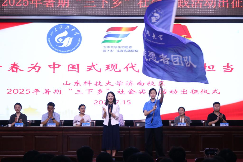7月15日下午,yl23455永利2025年暑期“三下乡”社会实践活动出征仪式在图书馆报告厅举行。共青团天桥区委书记陈亚楠,yl23455永利党委委员、电气信息系党总支书记兼学团工作部主任、学生党总支书记毛庆东出席,校区相关部门负责人、全体学生工作干部及“三下乡”社会实践重点团队师生代表100余人参加。