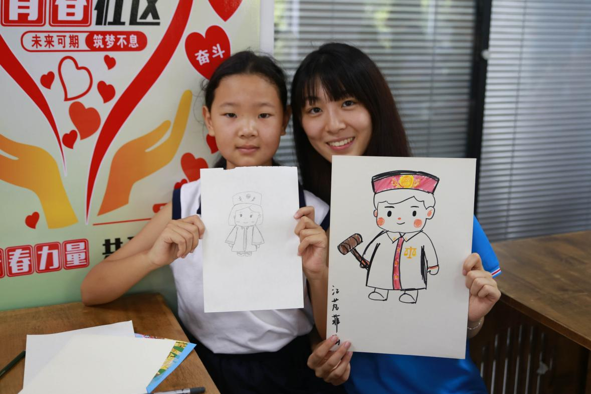 图为团队成员与课堂上的小同学共同绘画非遗小法官